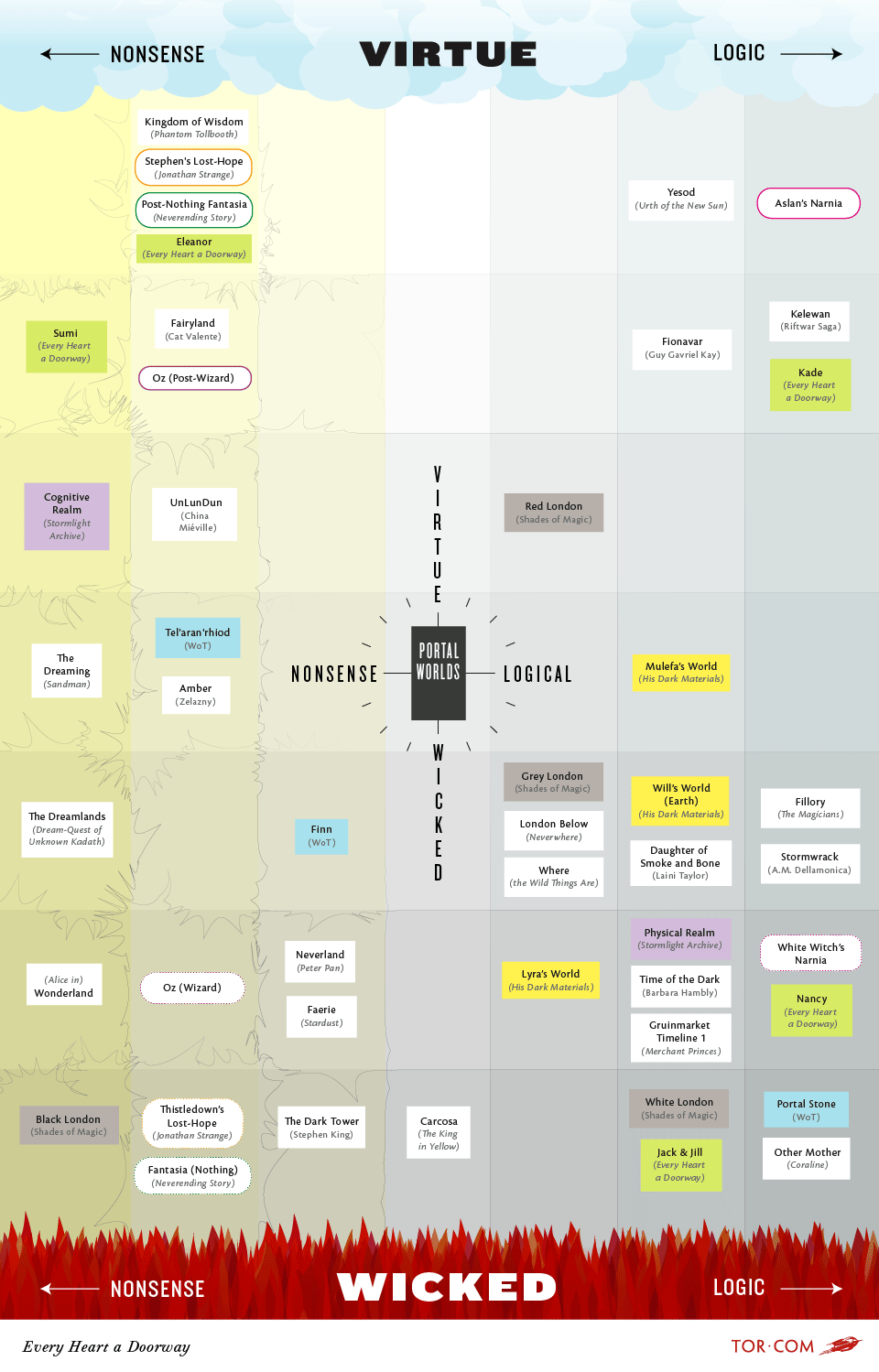 The series begins when a new student, Nancy, comes to live at Eleanor’s. From there, we are introduced to the rest of the characters: Kade, Sumi, Jack & Jill, Christopher and other main characters in later installments: Rini, Cora, Lundy (her younger/older self) and Regan. They are diverse on many levels, such as skin tone, body types, gender-fluidity and culture. Some of them are asexual, intersexual, trans, etc. Some of them went to Nonsense worlds, some of them went to High Wicked worlds. Some went to the Trenches. Others went to Fairylands or Underworlds. Instead of North, South, East and West, their map directions are Nonsense, Logic, Virtue and Wicked (you can see a map here). The creativity in this series will have your head spinning. It’s like anything goes…but sometimes it can’t. It just depends on which door you walk through.